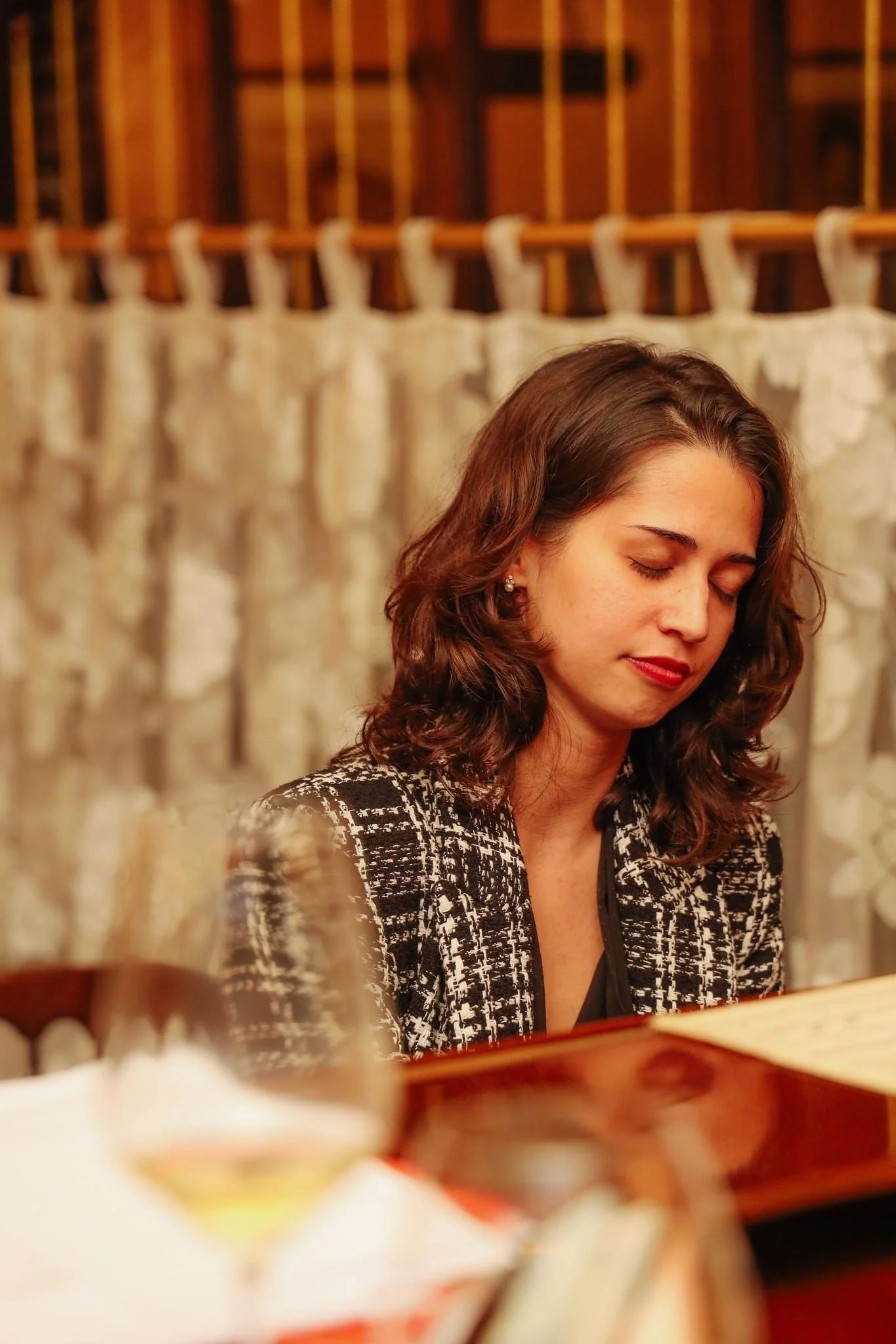 A young woman with closed eyes and curled brown hair, wearing a black and white patterned jacket, sitting at a table with a wine glass and a menu, in front of a decorative curtain and wooden lattice background.