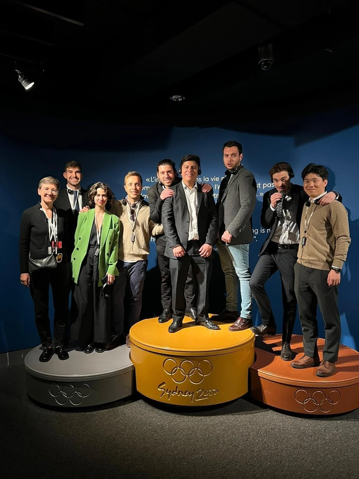 A group of people standing on a winners' podium at the 2000 Sydney Olympics, with three levels and the Olympic rings logo. The group appears to be celebrating, posing for a photo.