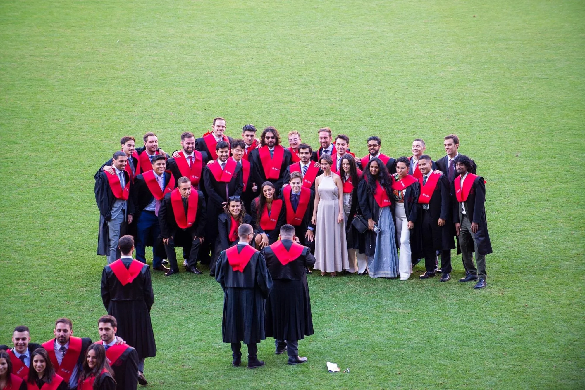 Group of graduates in caps and gowns posing for a photo on a green field.