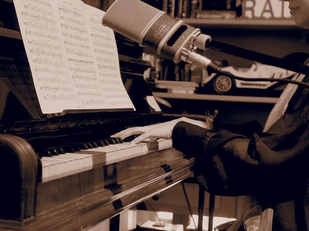 Person playing a grand piano with sheet music and a microphone nearby in a music studio or room.