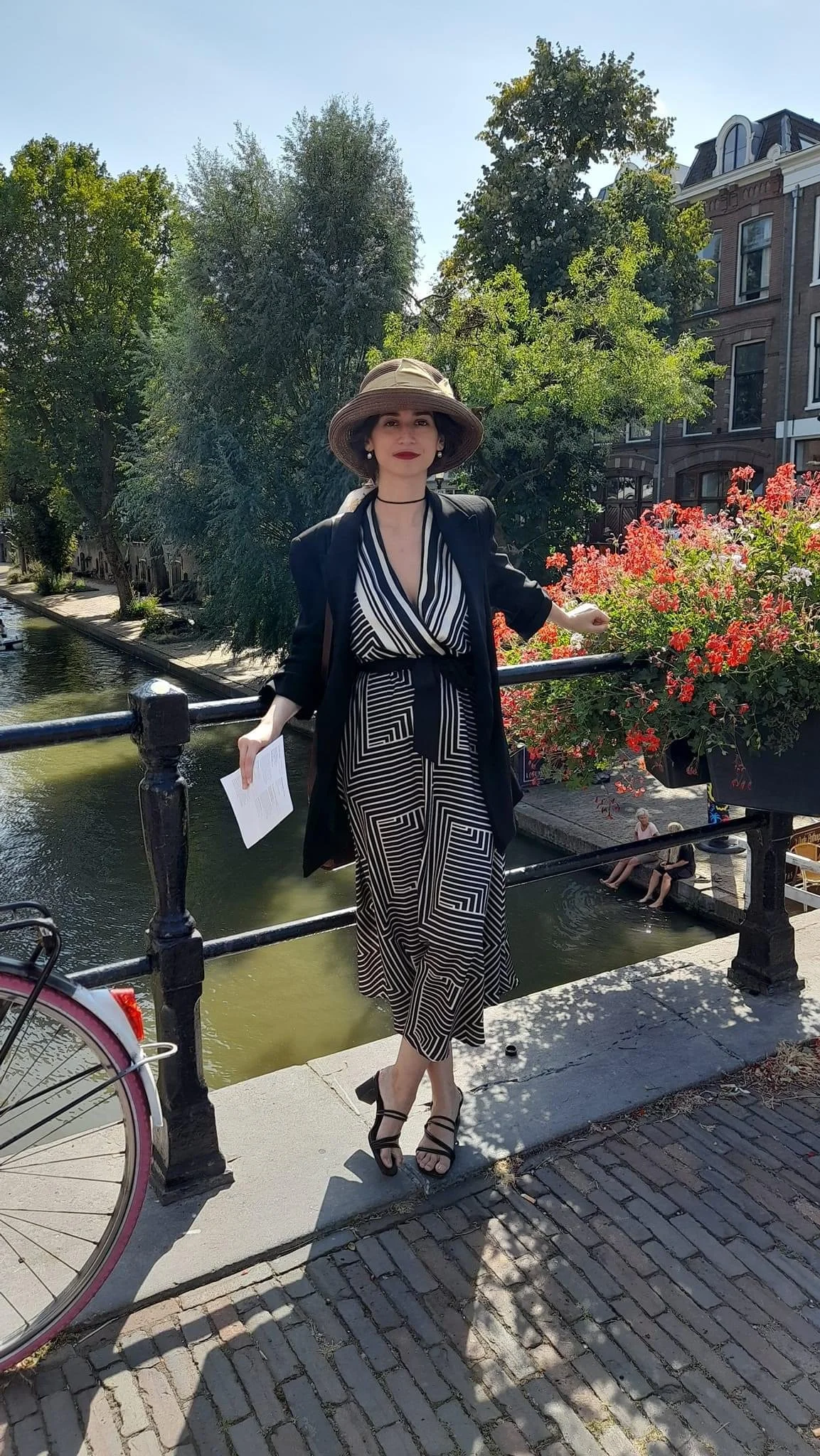 Woman standing on a bridge by a canal, wearing a black and white geometric patterned dress, a black blazer, a wide-brimmed hat, and black strappy heels, holding a piece of paper. There are trees, colorful flowers, and historic buildings in the backgr