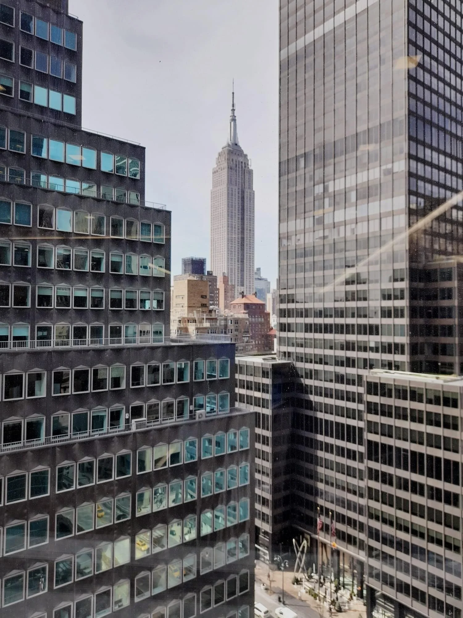 View of New York City buildings, including the Empire State Building in the background, seen through a window.