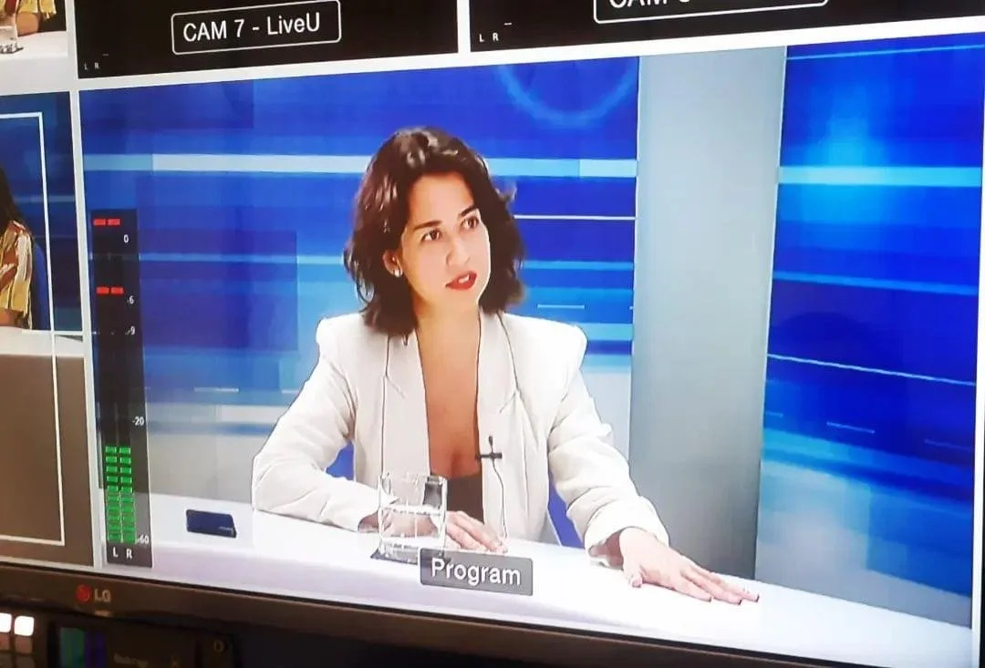 A woman sitting at a news desk with a glass of water in front of her, wearing a white blazer, on a television set with a blue background and camera information displayed at the top.