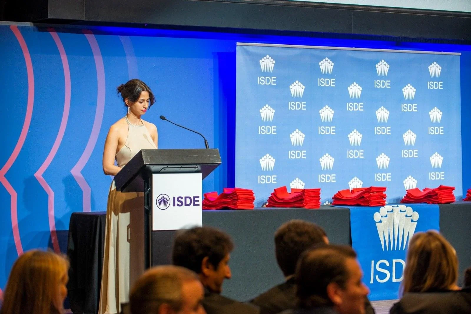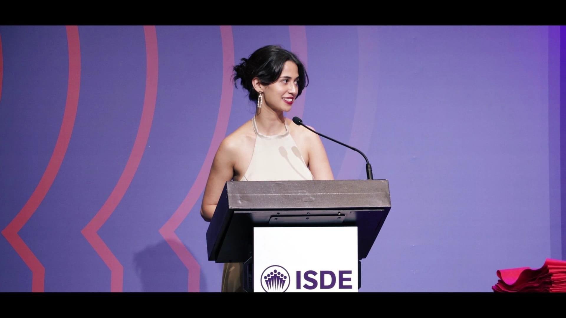 A woman with dark hair and wearing a light-colored dress stands at a podium with an ISDE sign, smiling, in front of a purple background with red and purple curved lines.